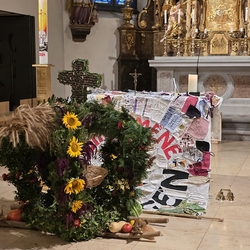 Wofür bin ich besonders dankbar? In der Zeichenhandlung waren alle Gottesdienstbesucher*innen eingeladen, persönliche „Dankesworte“ aufzuschreiben und in die Erntedankkrone zu legen.